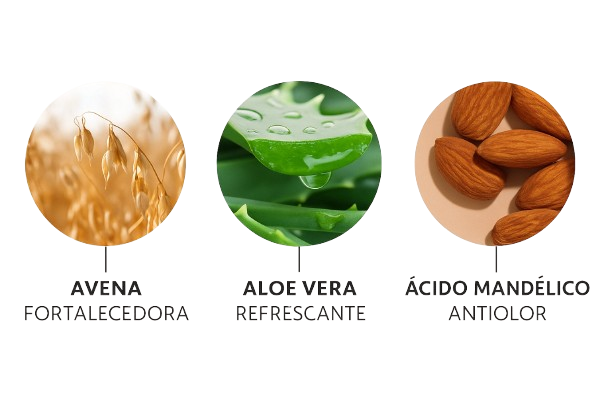 Aqua, Ácido Mandélico, Jugo de Hoja de Aloe Barbadensis, Polvo de Raíz de Maranta Arundinacea, Almidón de Oryza Sativa (arroz), Propanediol, Alcohol Ceteárico, Triglicéridos Cáprico/Cáprilico, Alcohol Behenílico, Hidróxido de Sodio, Aceite de Semilla de Avena Sativa, Harina de Avena Sativa, Alcohol Estearílico, Pantenol, Alantoína, Tocoferol, Glucósido Ceteárico, Goma de Sclerotium, Benzoato de Sodio, Sorbato de Potasio, Perfume, Tetra-metil Acetiloctahidronaftalenos.