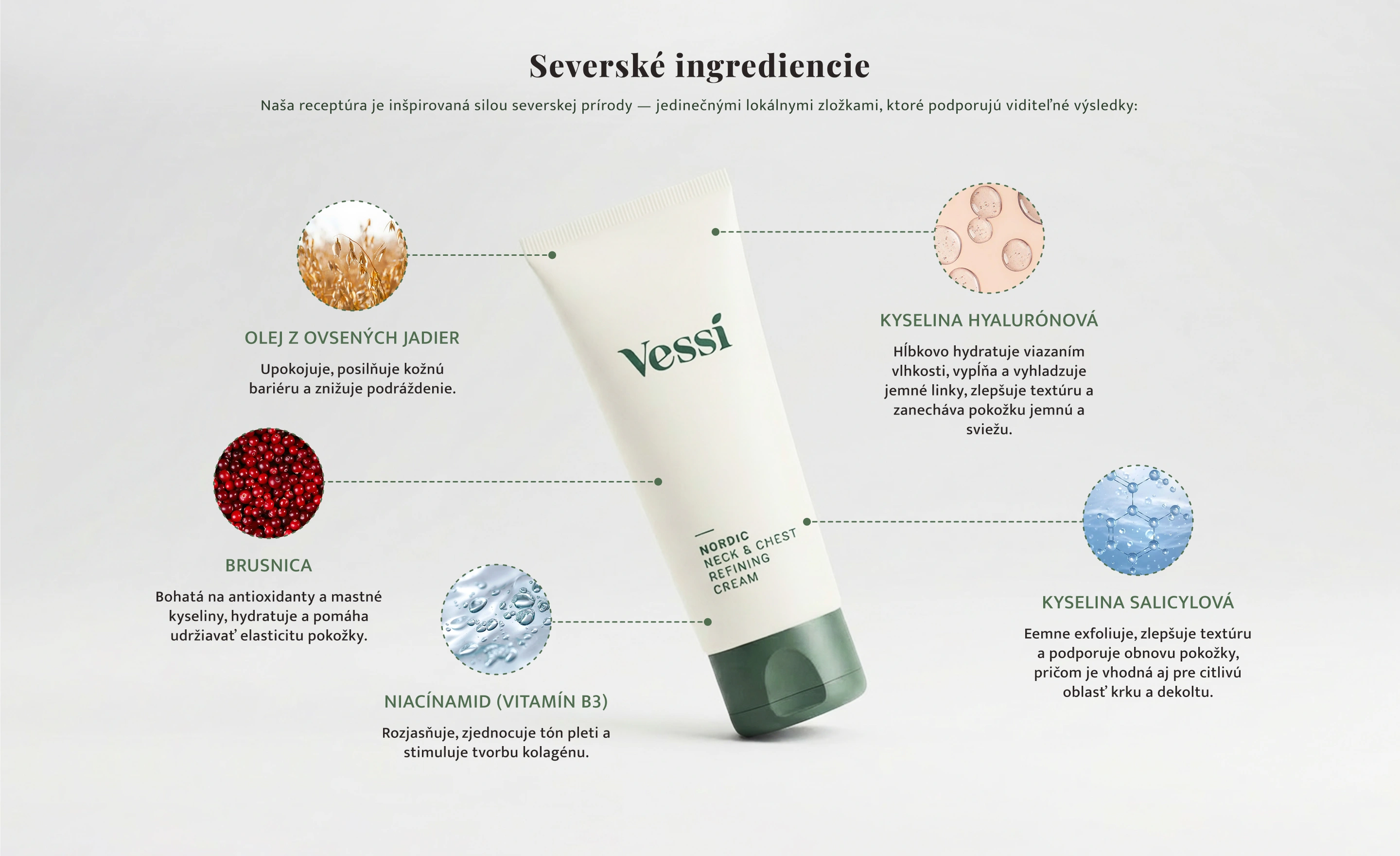 Vďaka tomu je Vessi Nordic Neck & Chest Refining Cream bohaté, vyživujúce zloženie, ktoré zlepšuje vzhľad krku a dekoltu, podporuje hladšiu a mladistvejšie vyzerajúcu pokožku.