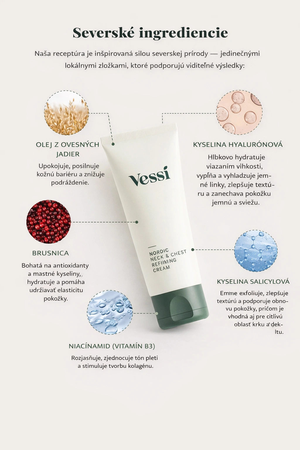 Vessi Nordic Neck & Chest Refining Cream je vyživujúce zloženie navrhnuté tak, aby hĺbkovo hydratovalo jemnú pokožku krku a dekoltu. Poskytuje aj spevňujúce a vyhladzujúce účinky, ktoré pomáhajú redukovať vrásky, nedokonalosti a jemné línie pre mladistvejší vzhľad.“
